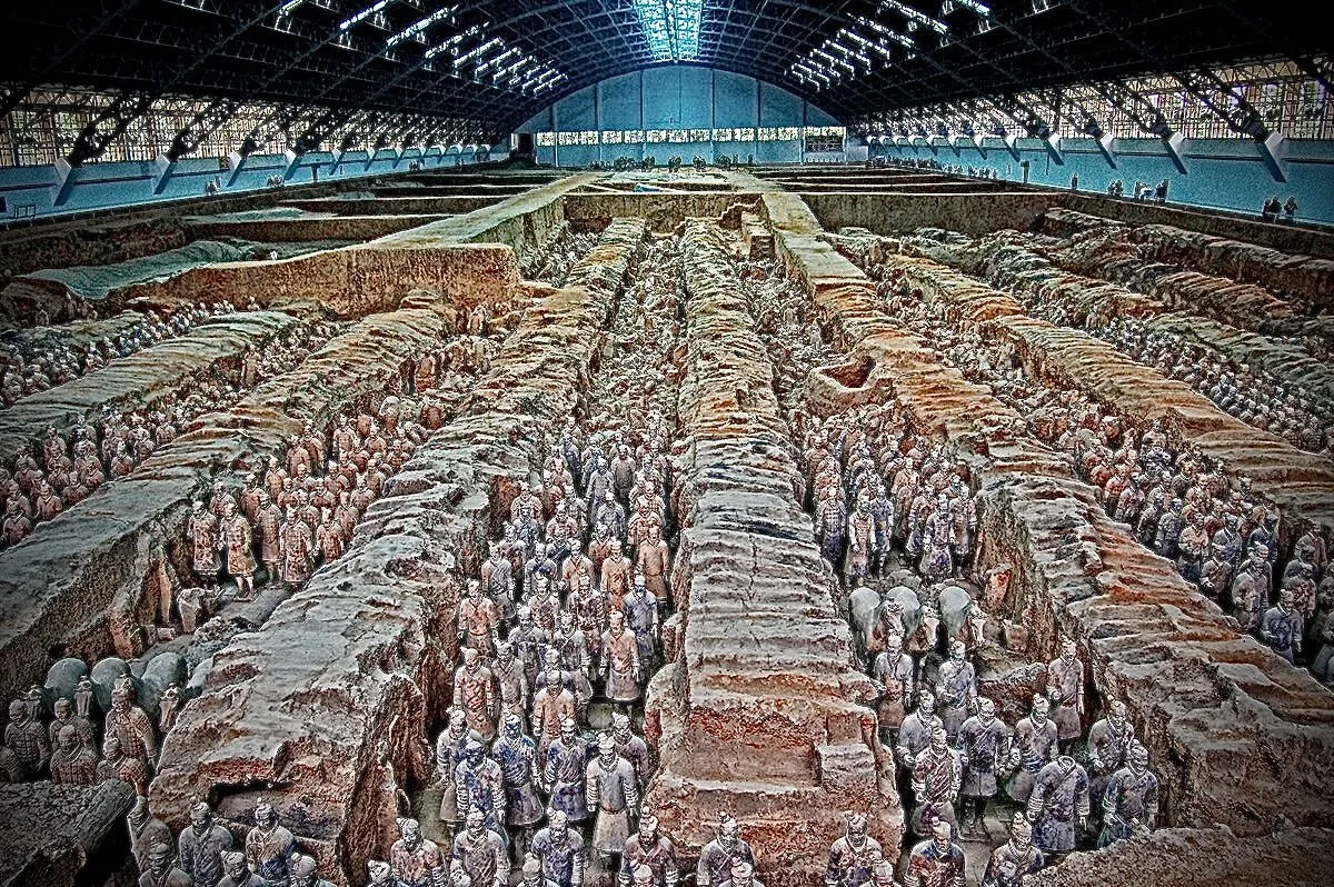 В 1974 году археологи в Китае обнаружили у мавзолея первого императора объединённого Китая Цинь Шихуанди в Сиане свыше 8100 глиняных статуй воинов, выполненных в натуральный рост 1,75 — 2,0 м., а также их лошадей. У каждой статуи воина свои черты лица, причёски волос, оружие. Есть в них металлические вставки из бронзы. Также недалеко от гробницы императора нашли скульптуры: музыкантов, прислуги, государственных служащих.
