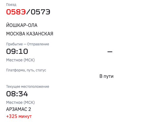 По данным онлайн-табло РЖД, поезд из Йошкар-Олы в Москву должен был прибыть на Казанский вокзал в 09:10, однако по состоянию на 08:30 он находился на станции «Арзамас-2» с задержкой на 5 часов и 42 минуты.