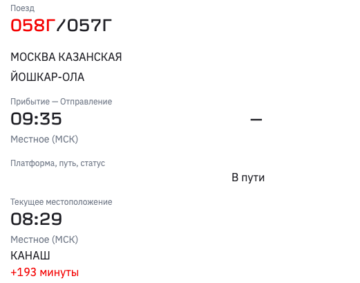 Поезд, который накануне выехал из Москвы в Йошкар-Олу, должен был прибыть в 09:35, однако по состоянию на 08:30 был в Канаше и опаздывал на 3 часа и 22 минуты.